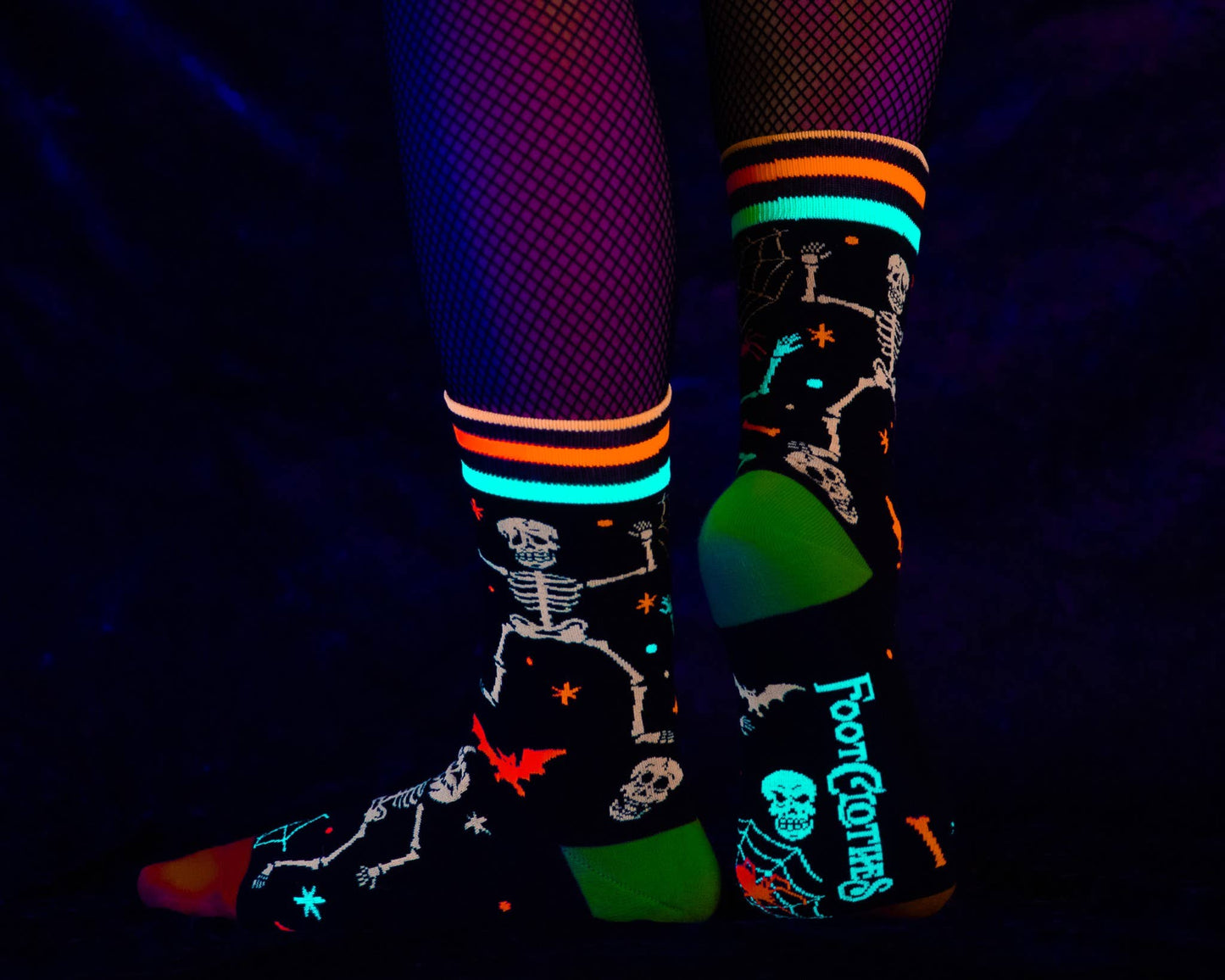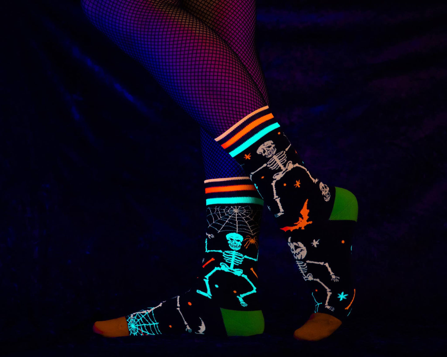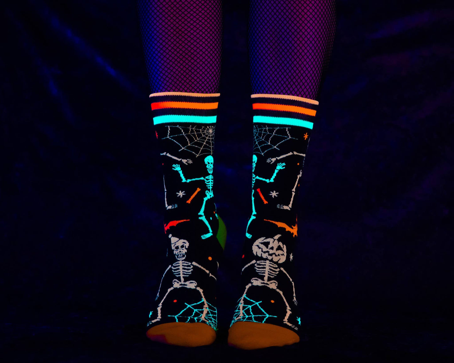 We like to think these socks are the physical manifestation of the EDM remix of that spooky, scary, skeletons song. UV. Reactive. Rave. Party. Skeletons.
