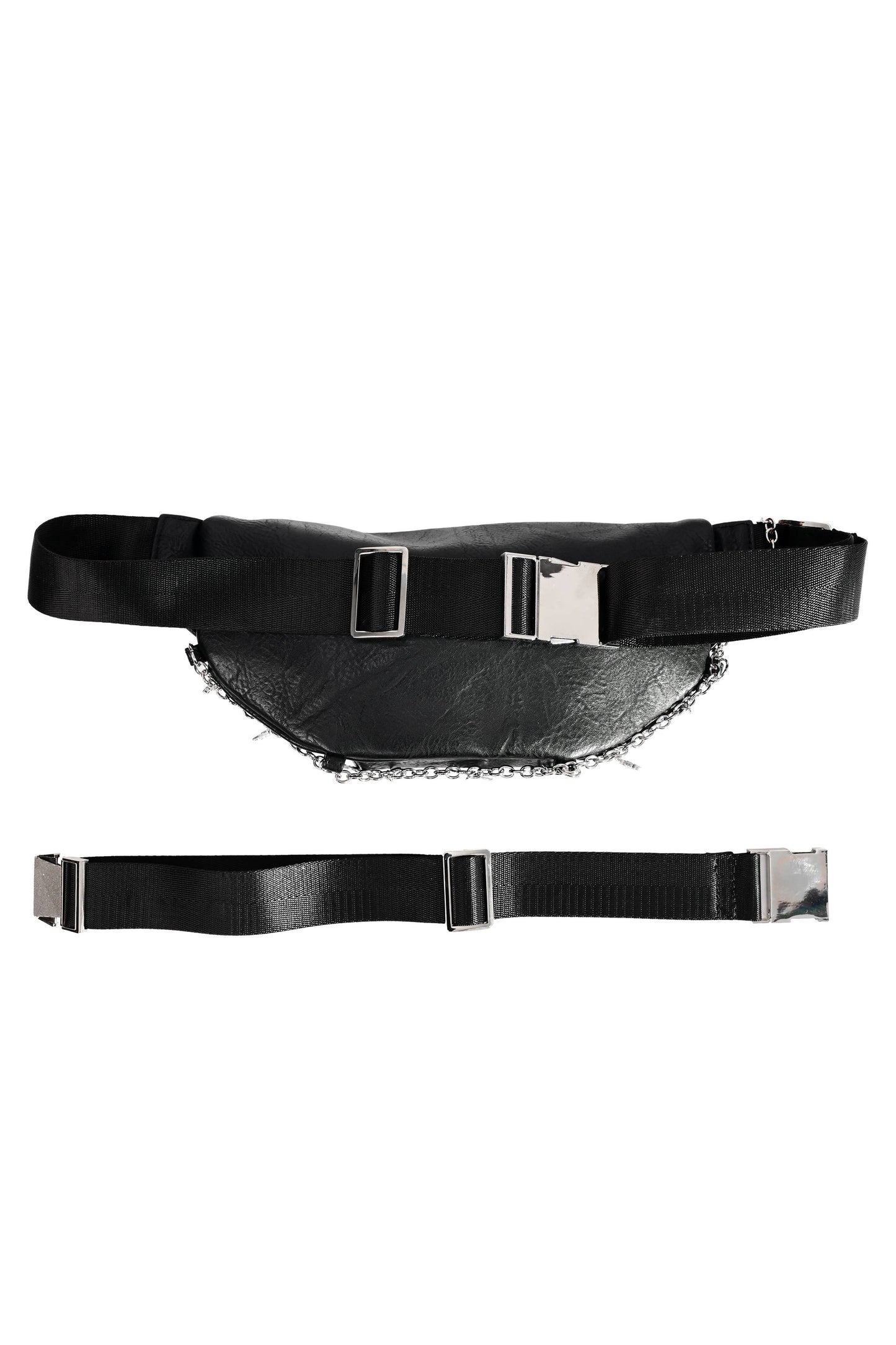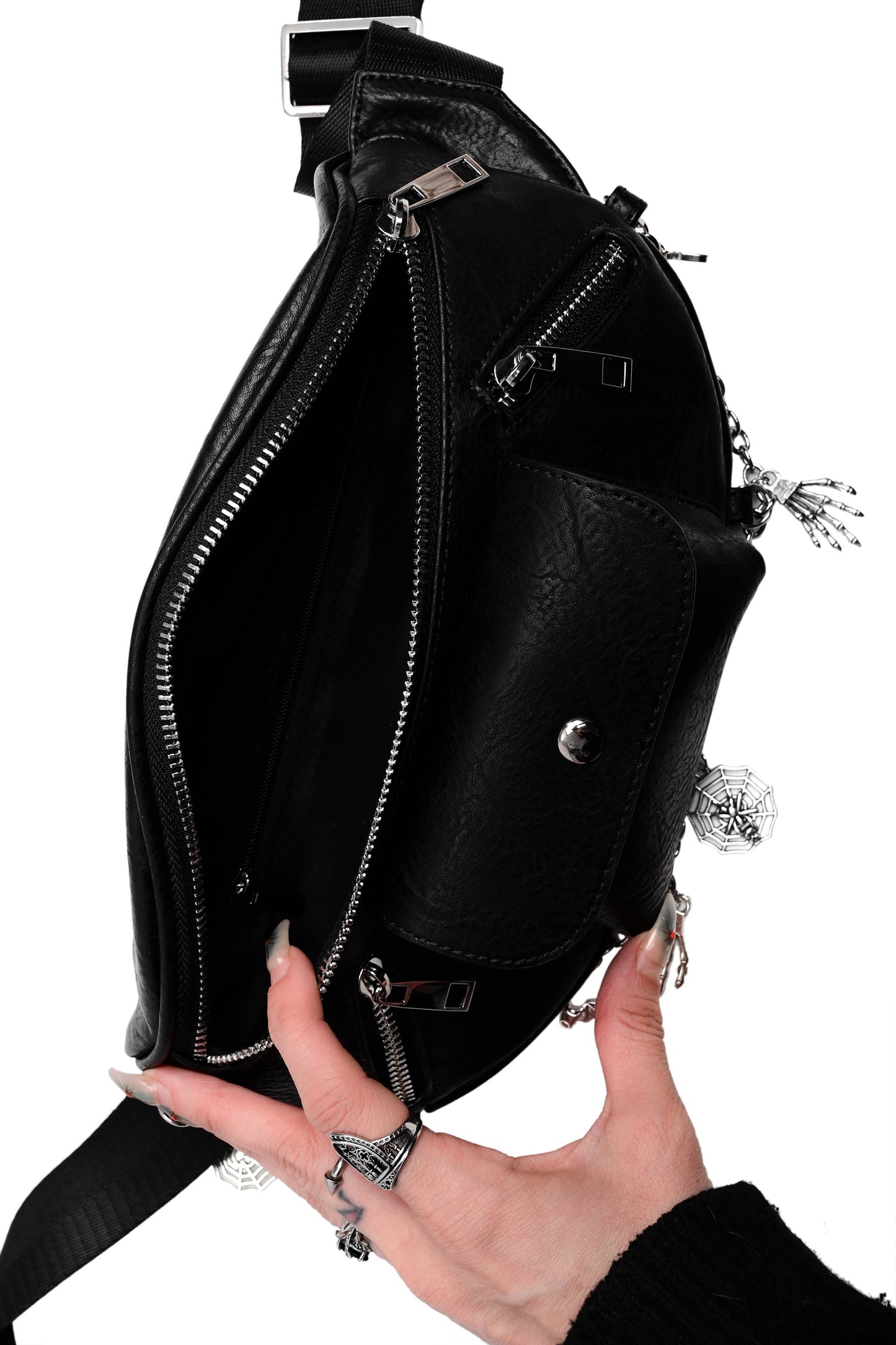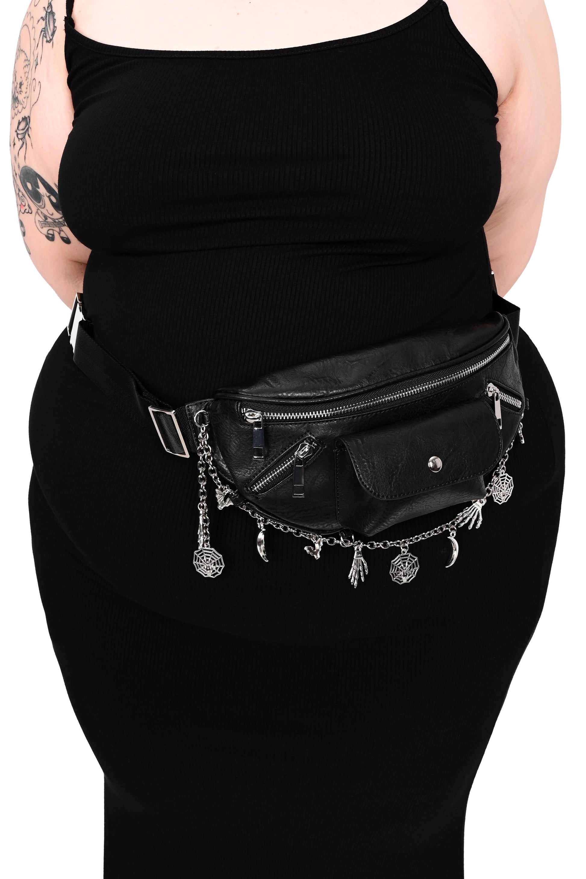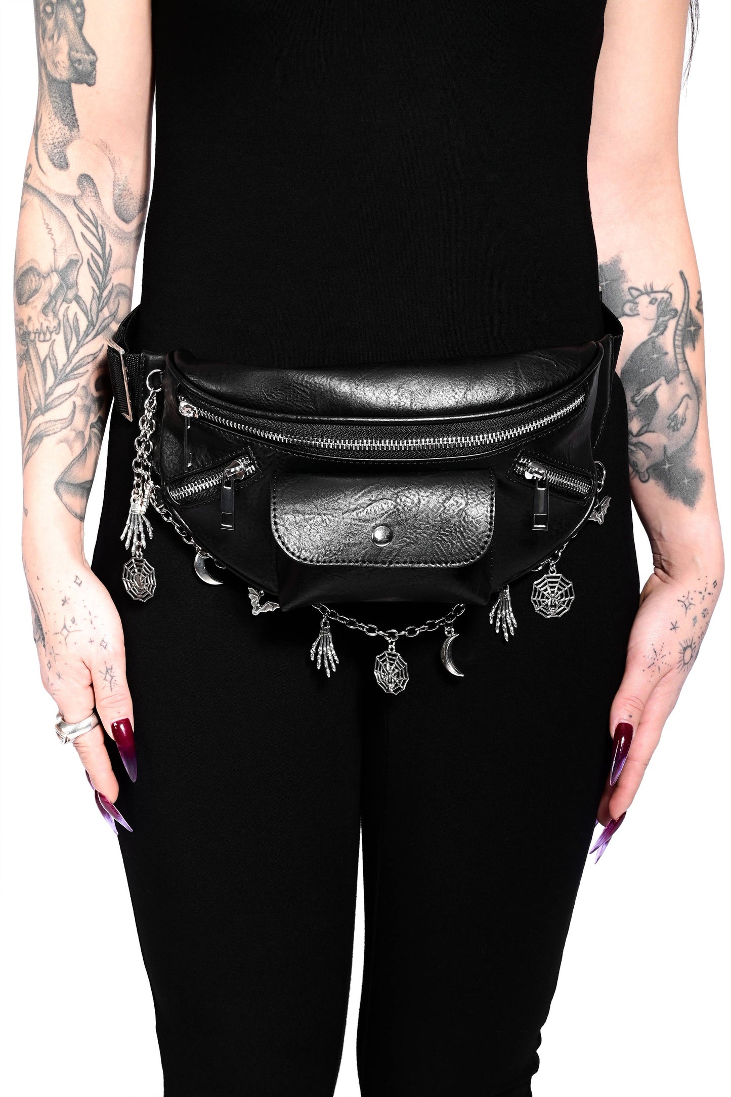 Black vegan leather fannypack with spooky charms attached along a chain on the bottom. Perfect for shows or festival season, and all the way through spooky season. Two small zipper pockets on front, and one pocket with button snap closure. Inside there is one zipper pocket. Includes belt extender! All silver hardware. 12" x 5.5" x 2" Strap without extender: up to 43.5" Strap with extender: up to 68" 100% Vegan Part of the FOXBLOOD Signature Collection.