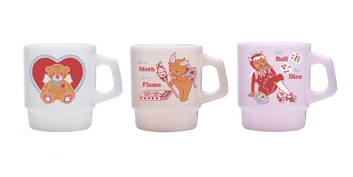 Like a moth to a flame, you can't resist this vintage style milk glass mug. This kewpie doll is a cutie pie in his moth costume. Perfect for valentines day, or an addition to your coquette decor!