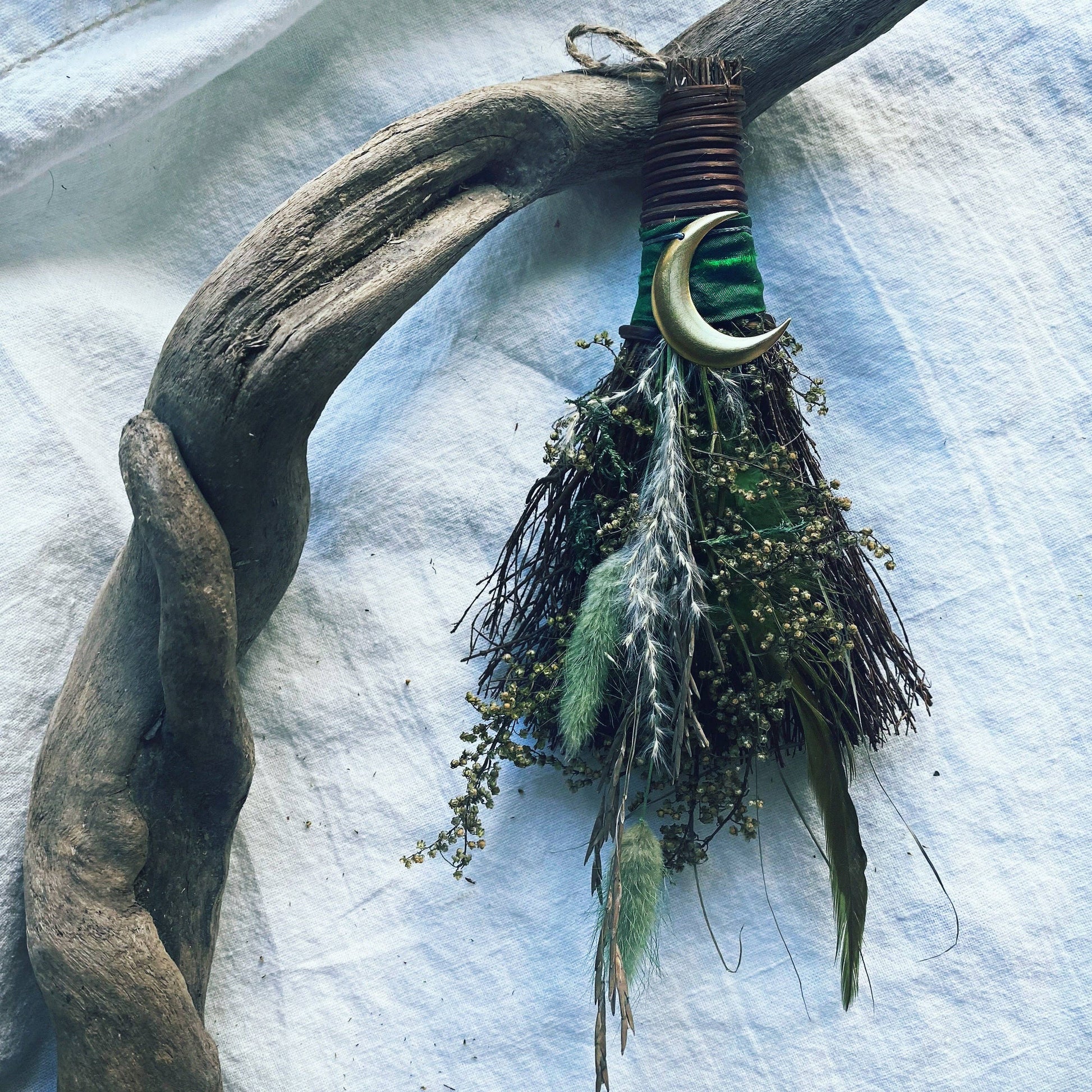 Beautiful enchanting mini broom with an earthy assortment of dried florals, Sweet Annie, colorful green feathers, silk sari ribbon and a golden moon charm.